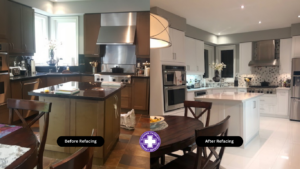- All old cabinet doors and drawer fronts are replaced with new stylish measured to fit doors and drawer fronts.