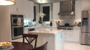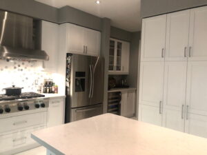 Prior to the refacing, the homeowners had the floors replaced with beautiful white porcelain floors. As an aside, if you’re thinking about replacing floors – do so before refacing just like these homeowners did. Have the flooring people remove the kick plate (a.k.a toe kick) before laying down the floors. This way, the new floors can be laid as close to the cabinets as possible. During refacing, a new kick plate is installed.