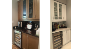For this kitchen transformation, all of the cabinets were left intact except the glass cabinets above the desk and in the butler’s pantry. Since these cabinets were going to be refaced with glass doors, and since the interior of the cabinets were brown, it made sense to replace the cabinets as well with white cabinets.