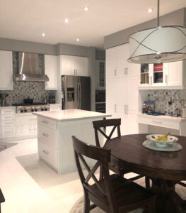 Wow – what a transformation, not only to the kitchen, but the entire floor space in that area. The colour scheme in the adjacent family room was white and this new kitchen now works with and compliments the rest of this first floor space.